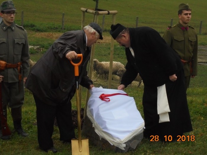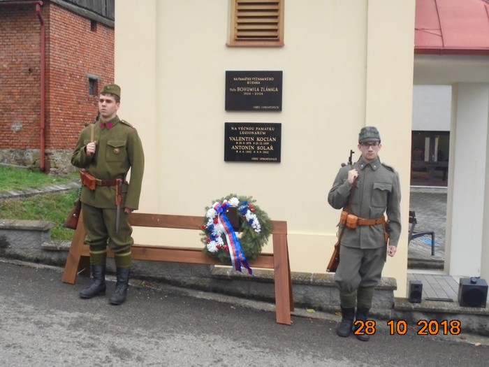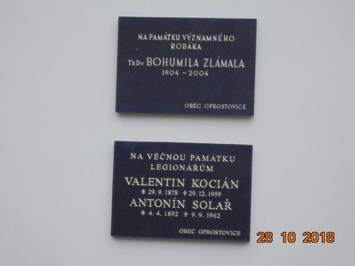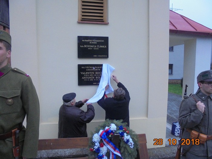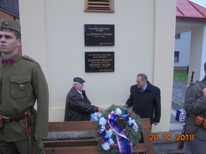 V neděli 28.října 2018 jsme v Oprostovicích oslavili 100 let trvání Československé republiky. Za 1. světové války bylo z naší vesnice odvedeno asi 26 mužů ve věku 18 až 50 let, kteří poté bojovali na bojištích v Rusku, Itáli a Srbrsku. Z nich se před koncem 1. světové války za hranicemi naší vlasti zúčastnili odboje dva občané, coby ruští legionáři. Byli to Valentin Kocián (*29.9.1878 + 29.12.1959) z čísla popisného 21, který po svém zajetí vstoupil do legií v Oděsse a Antonín Solař (*4.4.1892 + 9.9.1962) z čísla popisného 5, který se stal legionářem v Novgorodské guvernii Grjady. Na jejich památku byla na místní kapličce odhalena pamětní deska, pořízena nákladem pana Bohumila Solaře z Lipníka nad Bečvou, potomkem jednoho z legionářů. Na oprostovské legionáře vzpomenul modlitbou i otec Josef Červenka, soběchlebský kněz. V obecní kronice o roku 1918 píše tehdejší kronikář a správce školy Augustin Zábranský „ Po čem naši předkové v desátém koleně vzdychali a plakali, stalo se skutkem, zlatými zářnými písmeny zůstane všem pokolením národa českého zapsán den 28.10.1918.“ Na památku tohoto dne jsme v obci zasadili Strom svobody. Nedělní oslavu jsme zakončili posezením v kulturním domě s kapelou Tučéňáci a srnčím gulášem.